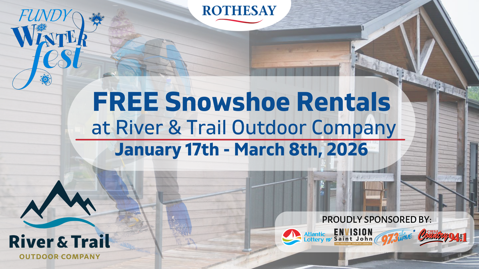 𝗘𝗻𝗷𝗼𝘆 𝗙𝗥𝗘𝗘 𝗮𝗱𝘂𝗹𝘁 & 𝘆𝗼𝘂𝘁𝗵 𝘀𝗻𝗼𝘄𝘀𝗵𝗼𝗲 𝗿𝗲𝗻𝘁𝗮𝗹𝘀 𝗮𝘁 𝗥𝗶𝘃𝗲𝗿 𝗮𝗻𝗱 𝗧𝗿𝗮𝗶𝗹 𝗢𝘂𝘁𝗱𝗼𝗼𝗿 𝗖𝗼𝗺𝗽𝗮𝗻𝘆 (located at 133 Hampton Road, Rothesay) during Fundy Winterfest from January 17th to March 8th, 2026. A refundable damage deposit and copy of photo identification will be collected at the time of rental. 𝗥𝗘𝗦𝗘𝗥𝗩𝗔𝗧𝗜𝗢𝗡𝗦 𝗥𝗘𝗤𝗨𝗜𝗥𝗘𝗗. Please call to reserve – (506) 849-7717, quantities are limited. Snowshoes will be picked up and dropped off by the user at River and Trail Outdoor Company located at 133 Hampton Road. 𝗦𝗻𝗼𝘄𝘀𝗵𝗼𝗲𝘀 𝗠𝗨𝗦𝗧 𝗯𝗲 𝗿𝗲𝘁𝘂𝗿𝗻𝗲𝗱 𝘁𝗵𝗲 𝗱𝗮𝘆 𝗮𝗳𝘁𝗲𝗿 𝗽𝗶𝗰𝗸-𝘂𝗽