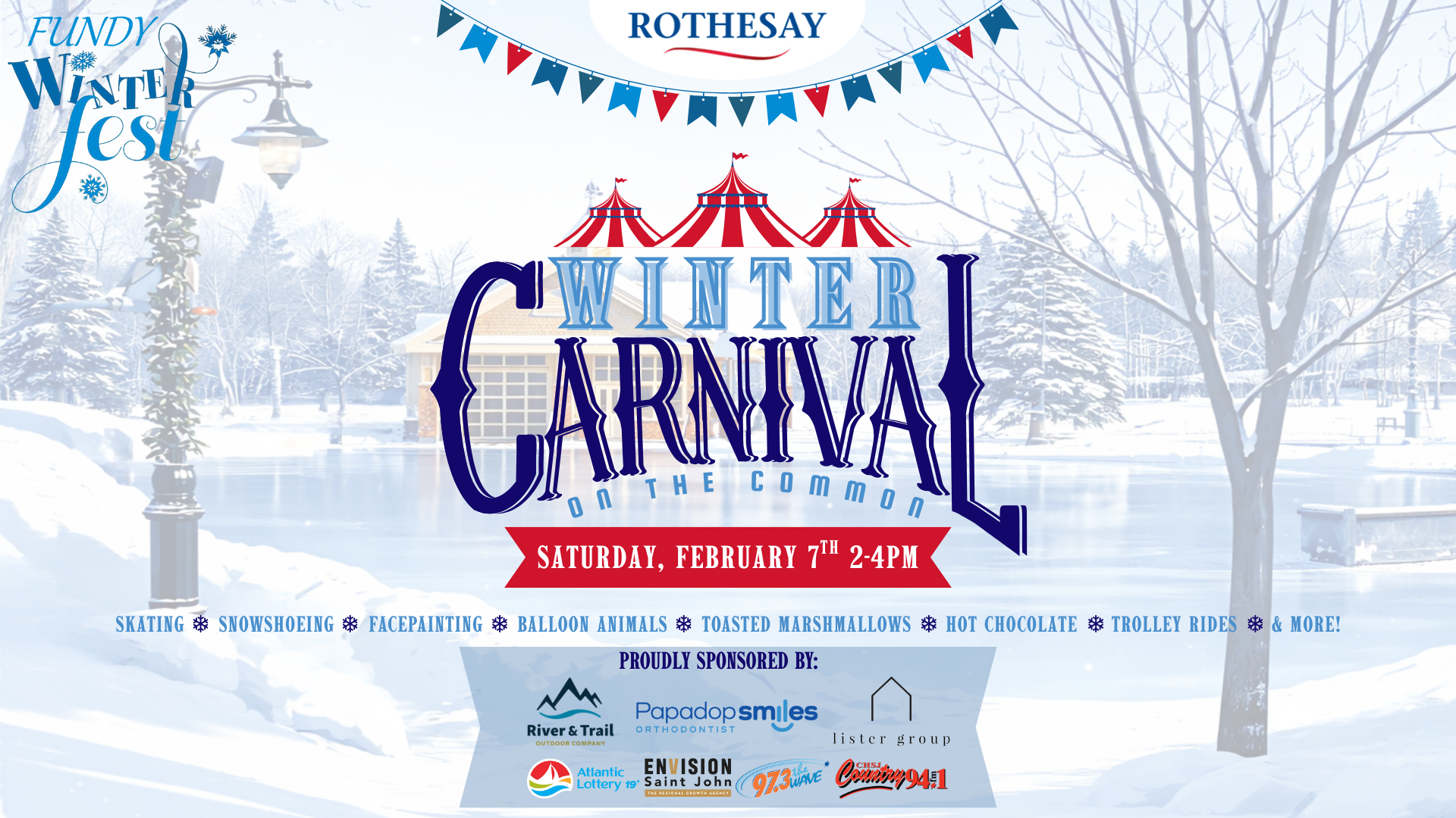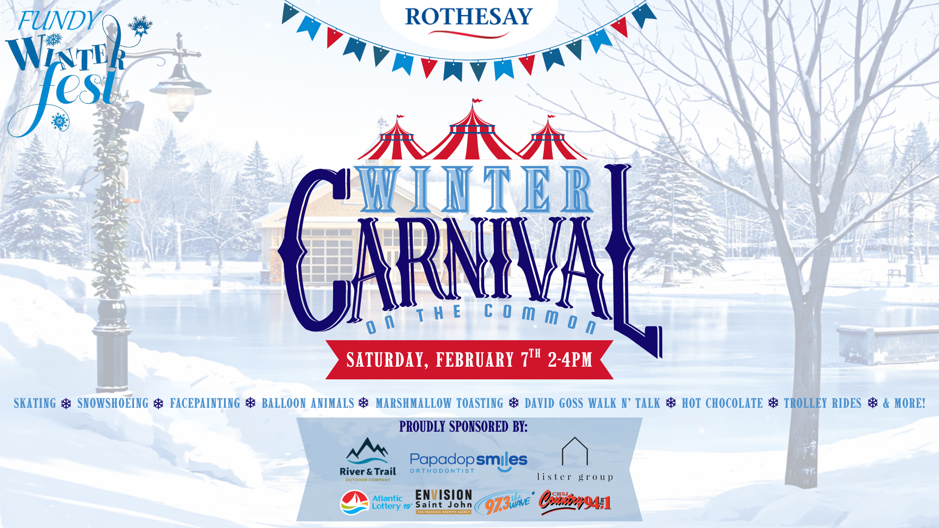This year, the Winter Carnival on the Common takes place on Saturday, February 7th, from 2–4 PM at the Rothesay Common and inside the Rothesay Park School cafeteria. In case of inclement weather, the event will be held on Sunday, February 8th, at the same time.